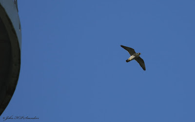 Even non-birders have heard of a Peregrine Falcon. A bird that can fly at eye-watering speed, a thing of legend and thankfully a bird that is getting more and more common. The bird is still persecuted by some, especially Pigeon fanciers who object to losing their prized flying rats to these magnificent creatures. I know of at least two sites in the local area where these birds are to be found regularly and I managed to catch up with a pair at one of these sites yesterday where the above heavily cropped photos were taken.